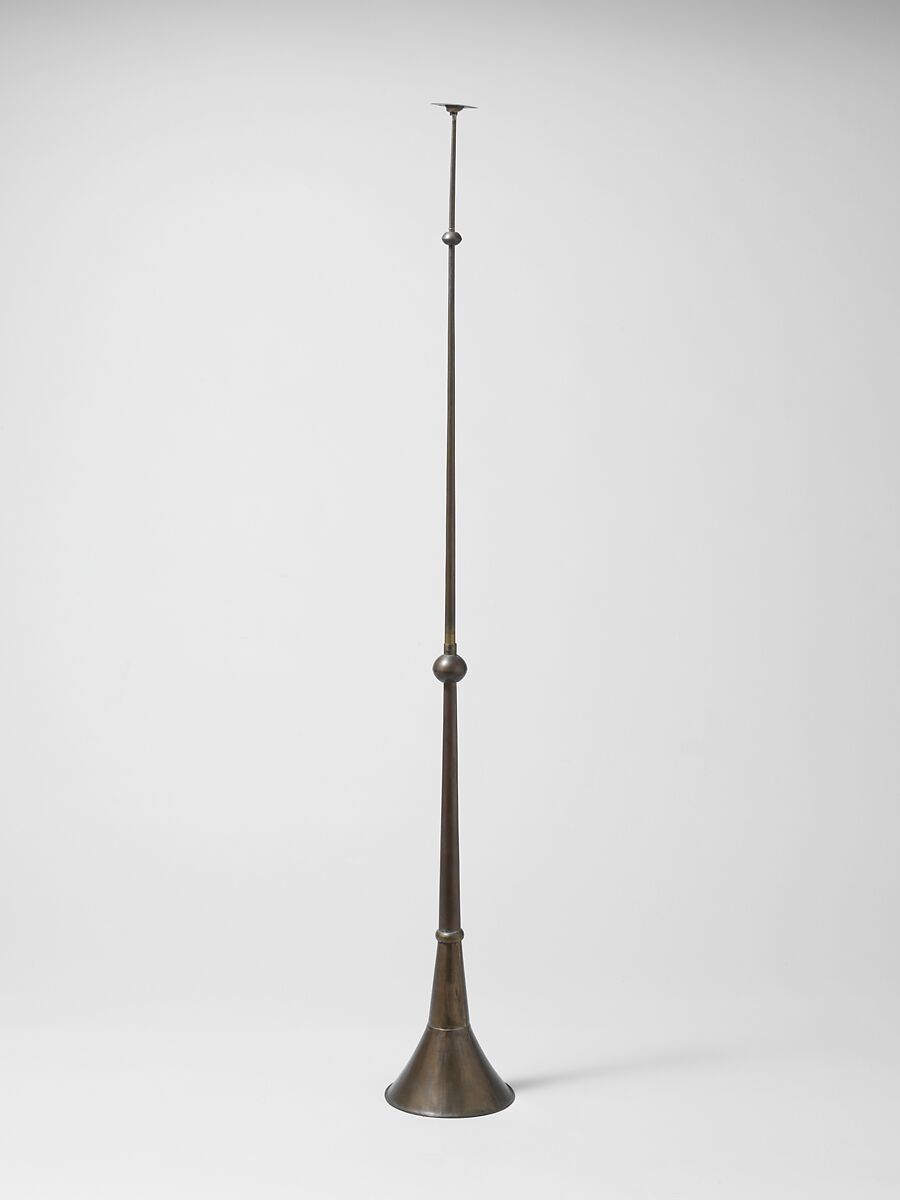 Like many other instruments, the straight trumpet was introduced into China from Central and West Asia during the Eastern Han dynasty (A.D. 25-220). Originally used with drums and loud wind instruments in state processions and military events, this type of trumpet served a number of purposes during the nineteenth century. It was played in pairs by soldiers, blown by firefighters when they had finished putting out a fire, and sounded at funerals and at the end of some theatrical performances. Itinerant knife grinders and peddlers used a smaller version. The laba exists in a variety of sizes, and like many Asian trumpets, it has a wide, shallow mouthpiece and is collapsible.