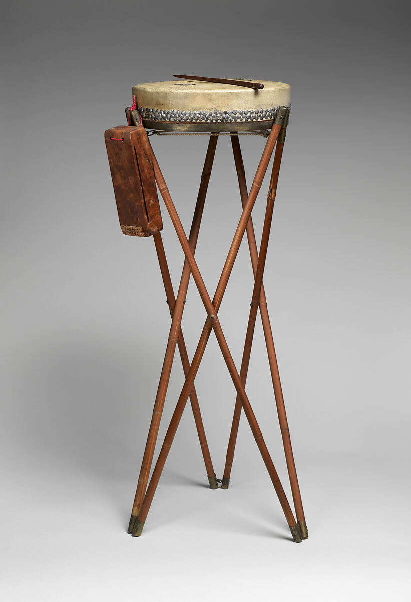 The interior of the bangu has six wood wedges held together by a brass belt and tightly stretched cowhide. When struck, this small drum produces a sharp, dry sound to signal the different tempi of the piece. Several sounds may be produced depending on where it is struck.