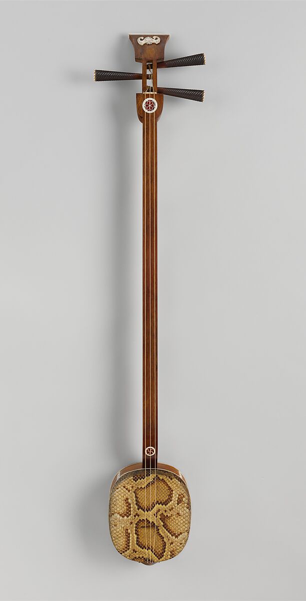 There are two forms of the sanxian: a large one from the North, with a thin metal plate attached inside to enrich the sound, and a smaller version from the South. Like the pipa, the sanxian may accompany narrative song, changing its tuning to accommodate the singer. The bat decorating the finials of this instrument is a symbol of good fortune and appears on many Chinese objects.