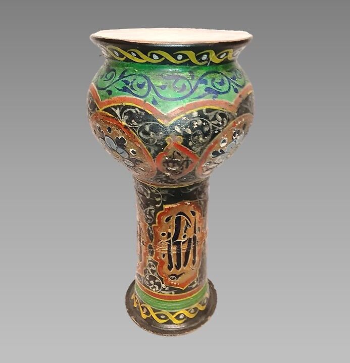 Darabukka, a single-headed, goblet-shaped drum. The ceramic body is painted with geometric designs and calligraphy which appears upside down in this photo but is easily read when the instrument is played.