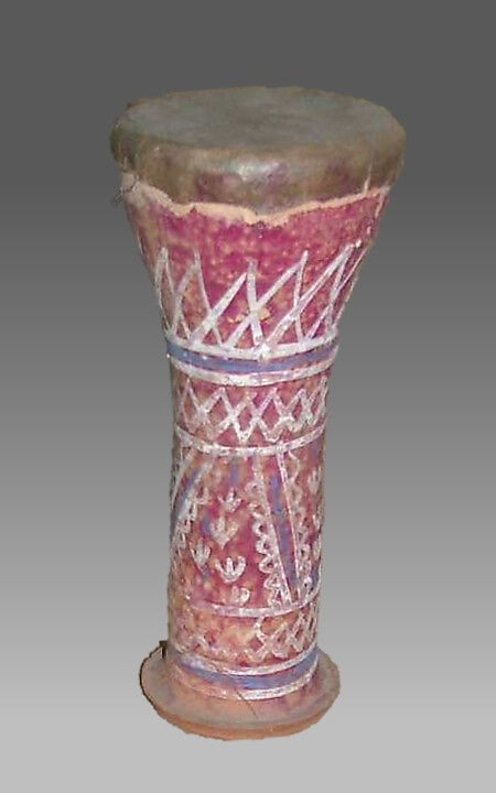 This slender vase-shaped drum is used in the spiritual music of the Aissawa and Daqqa polyrhythmic ensembles of Marrakech to accompany ritual dance.