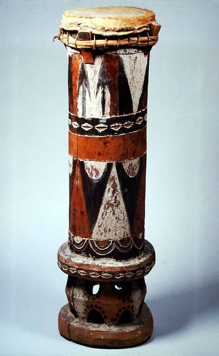 Mbejns are characterized by a carved openwork "arcade" base, decorative sections separated by bosses or lozenge (cowrie-shell) pattern bands, triangular and hemispherical devices, and alternating use of white, black, rust, or natural wood colors. Typically the head's tuning and attachment system relies on wedges to tighten or relax the tension of the skin. This type of drum, made in several sizes and used in pairs, is played in an upright position and is usually employed with one or two large slit drums (m'kuls) to provide rhythmic accompaniment to large group dances. The Mbejn is one of the few drums used by the Fang people.
