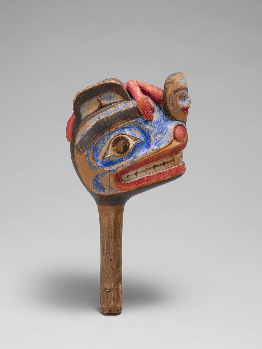 This rattle depicts a grinning mountain spirit, potentially that of a bear. The spirit would act as the intercessor for the human figure found between the ears. The rattle represents the relationship between the two and how the owner would depend on the spirit for strength and guidance.