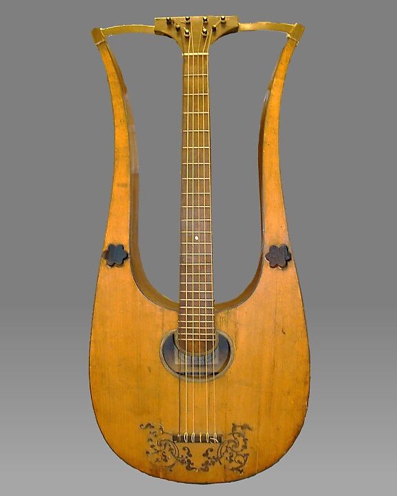 This instrument despite its unusual form is a six-string guitar which would have been played much like the guitar in the ordinary form. The two wings which project to the same distance as the neck and head act merely to resemble the supporting pillars of the ancient Greek Lyre. In fact the two projections would have hindered rather than helped the player, the upper wing would obscure the left hand which itself would have been obstructed by the lower wing. (Daniel Wheeldon 2016)