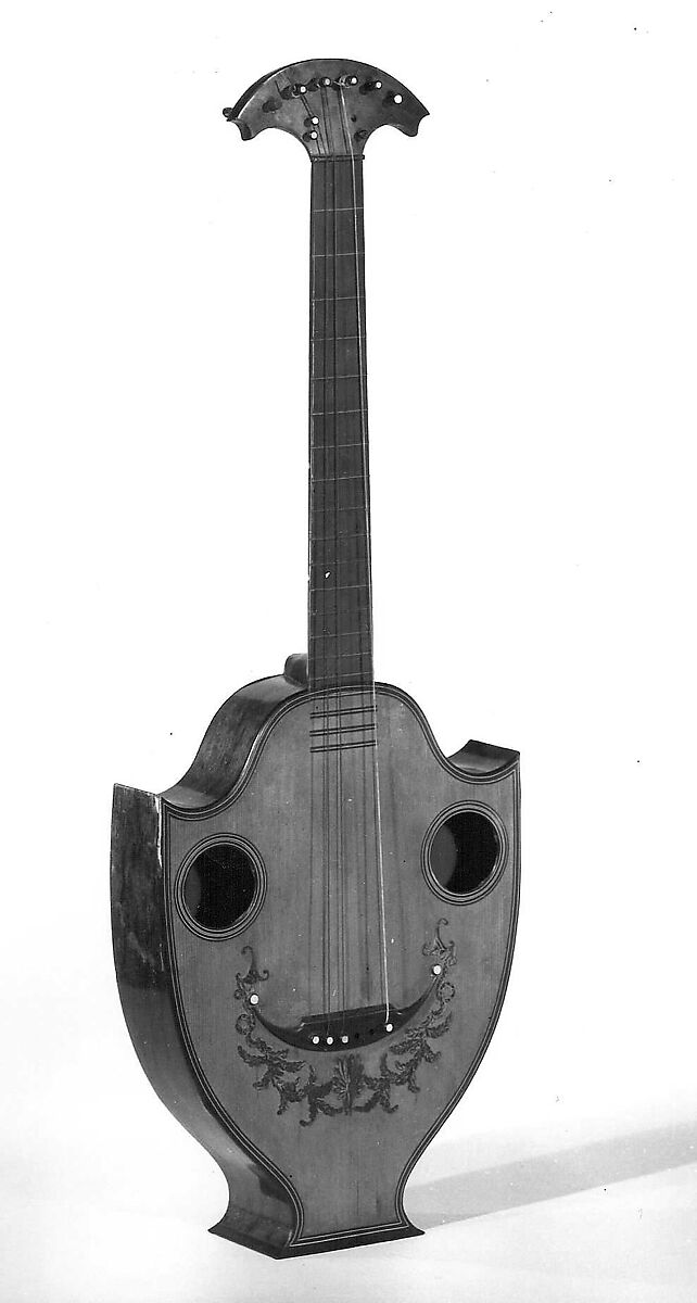 Essentially a lyre-guitar with abbreviated arms, this variant was fitted with a flat base so that it could stand as a table ornament. The back and sides are of figured mahogany; the top is of spruce. Six single courses of strings.