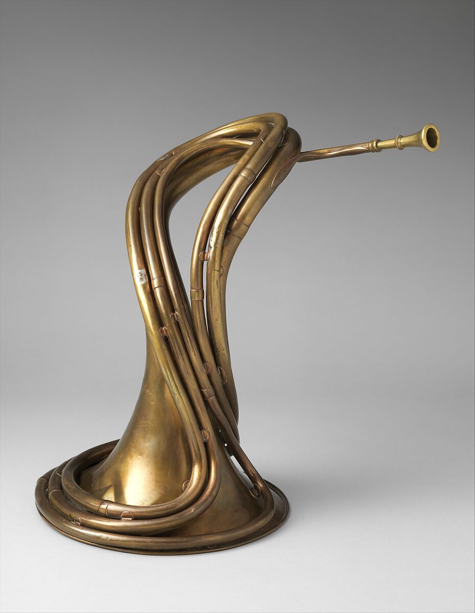 This unusually wound hunting horn was designed to be more easily handled than the traditional large and unwieldy hooped horn used in the field to signal to members of the hunting party. Its ergonomic form enables it to be tucked snugly under the arm against the player’s body for safe and convenient carrying.