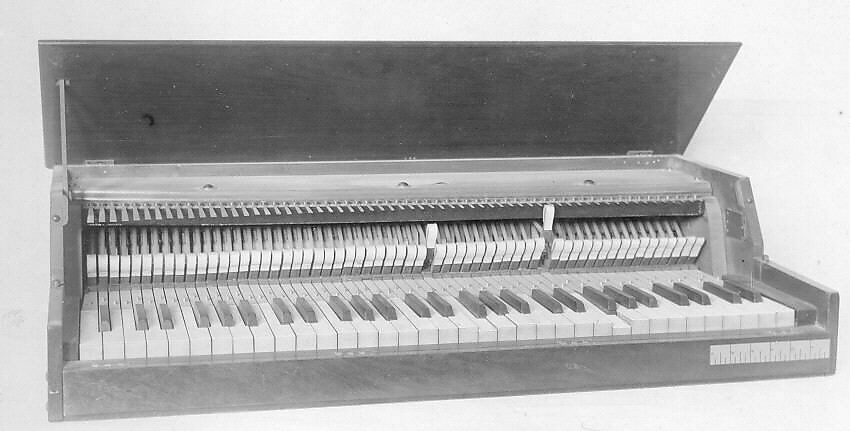 Walnut case held together with large screws, rectangular when viewed from above, without legs or stand, enclosing a keyboard (compass 61 keys, ivory naturals, ebony accidentals) that controls a simple English grand piano action whose felted hammers, extending forward toward the player, strike thin steel tongues; these tongues are graduated in length and width and are screwed at the back end to a metal bar that extends beneath a removable wood panel; panel, bar, and tongues can be removed as one unit, and are mounted above the piano action in a raised portion of the case, covered by a hinged lid and fronted with a cloth-backed fret-work panel; the keyboard is covered by a fallborad holding a hinged music rack, below which is the nameboard; no damper mechanism or resonators. (Laurence Libin 4 Oct. 77)