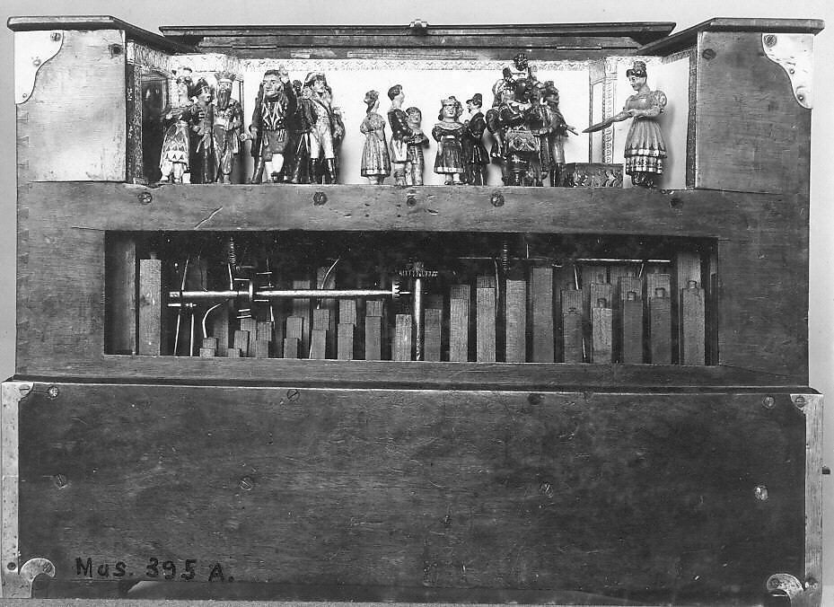 Technical description: Rectangular walnut case with panel of display pipes on front, and above this, enclosed by a four-piece hinged lid, a mirror-lined stage (with embossed gold paper borders) supporting 18 moving figurines of dancers, musicians, and soldiers; brackets on sides held carrying strap (missing); four handstops on right side control four ranks of open and stopped wood pipes mounted within and horizontally below the case; a pinned and stapled barrel operates stickers that open valves in the windchest; a crank extending from the case back turns a combination worm and crank shaft that rotates the barrel and pumps a single fold feeder below a reservoir covered in decorative paper (two layers); a gear connected to the barrel engages a train of gears, shafts and springs that activate the figurines; a ten-notch shift pin projecting from the barrel is engaged by a drop latch on the left side, permitting tune selection; two reed pipes (?) (missing) mounted on a box on case bottom were operated by a stop lever; pitches indicated on sticker pin rail: T (trumpet?), C, D, E, F, F#, G, A, H, C, D, E, F, F#, G, A, H, C, D, E, H, G, C.