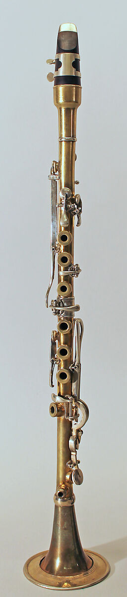 Technical description: Brass 'skeleton' body with German silver keywork. Four pieces: mouthpiece, barrel, one-piece-body, bell. Rosewood mouthpiece with a metal tip and facing grooved for cord. Funnel shaped barrel. Straight short speaker on the back of the instrument. Speaker liner projects almost to the centre of the bore. German silver ferrule in the middle of the section carries the key for C♯4/G♯5. Shaped German silver thumb rest soldered to the back of the instrument. Integral music card holder indicates that this instrument is used in marching or military band. Bell fixed to body with thread of screw.