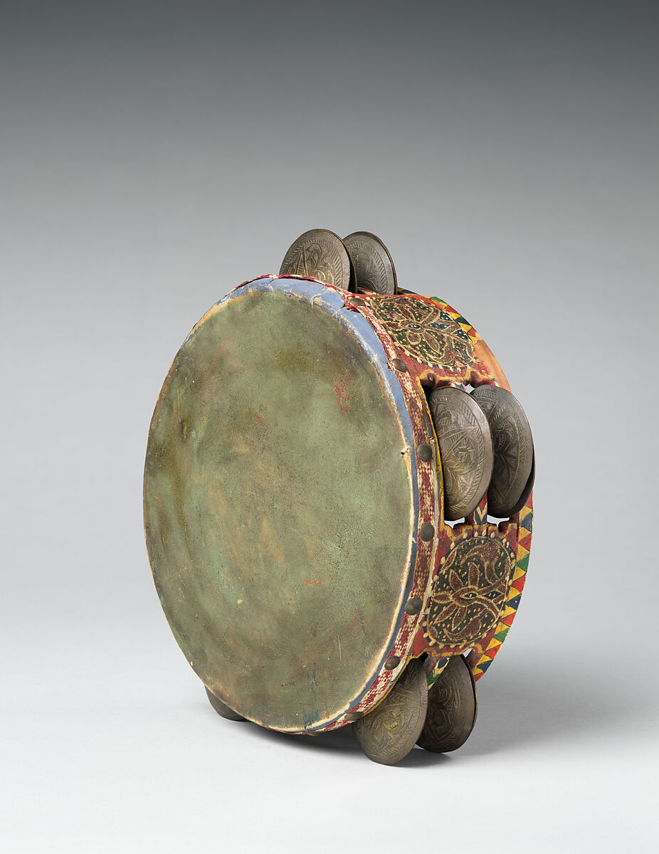 Description: Circular wood frame decorated in bright colors; skin, green stained and fastened with upholstery tacks; two pairs of embossed metal cymbals distributed in five windows spaced equidistantly around the frame's wall; a thumb rest on the inside.