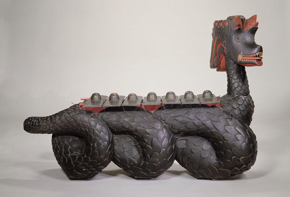 This playful, now obsolete, Javanese instrument combines antiquated tuned, knobbed bronze bars with a dragon-shaped frame, designed to appeal to European collectors. A trough beneath the bars serves as a resonating chamber. Today, the slento has been replaced by the slentem, a single octave metallophone with thins, flat bars which are suspended on rope above individual tube resonators. A wood or horn beater used with the slento has given way to a padded, disc-shaped mallet associated with the slentem.