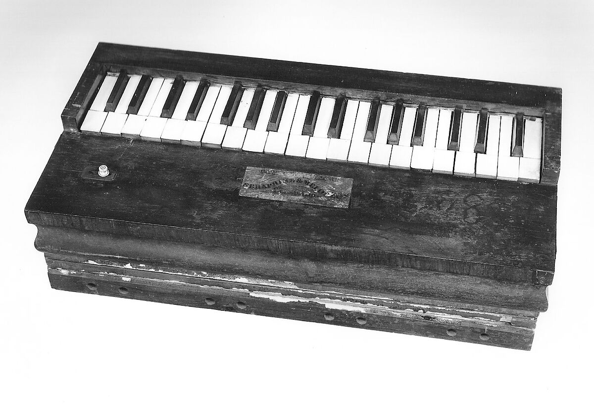 Technical description: Rectangular case of rosewood veneer above a diagonally-divided double bellows; removable top panel with paper label on front portion, keyboard along rear edge; compass G-g2, ivory naturals, ebony accidentals; brass free reeds beneath front portion of removable face panel, each reed with an incised roman numeral (I through VIII, repeated); reeds blown rather than sounded by suction; U-shaped reed holders set with ends pointing up; lower bellows leather separated from wooden frame, revealing the inside of the leather lined with newspaper dated June 5, 1843