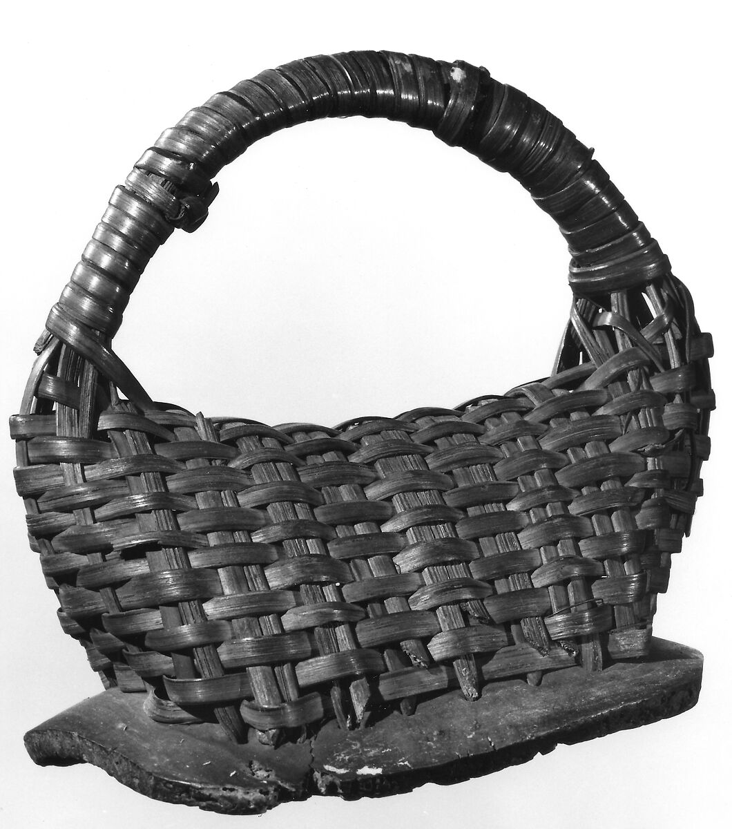 The pocketbook shaped basket rattle is made of woven fiber with a gourd base.