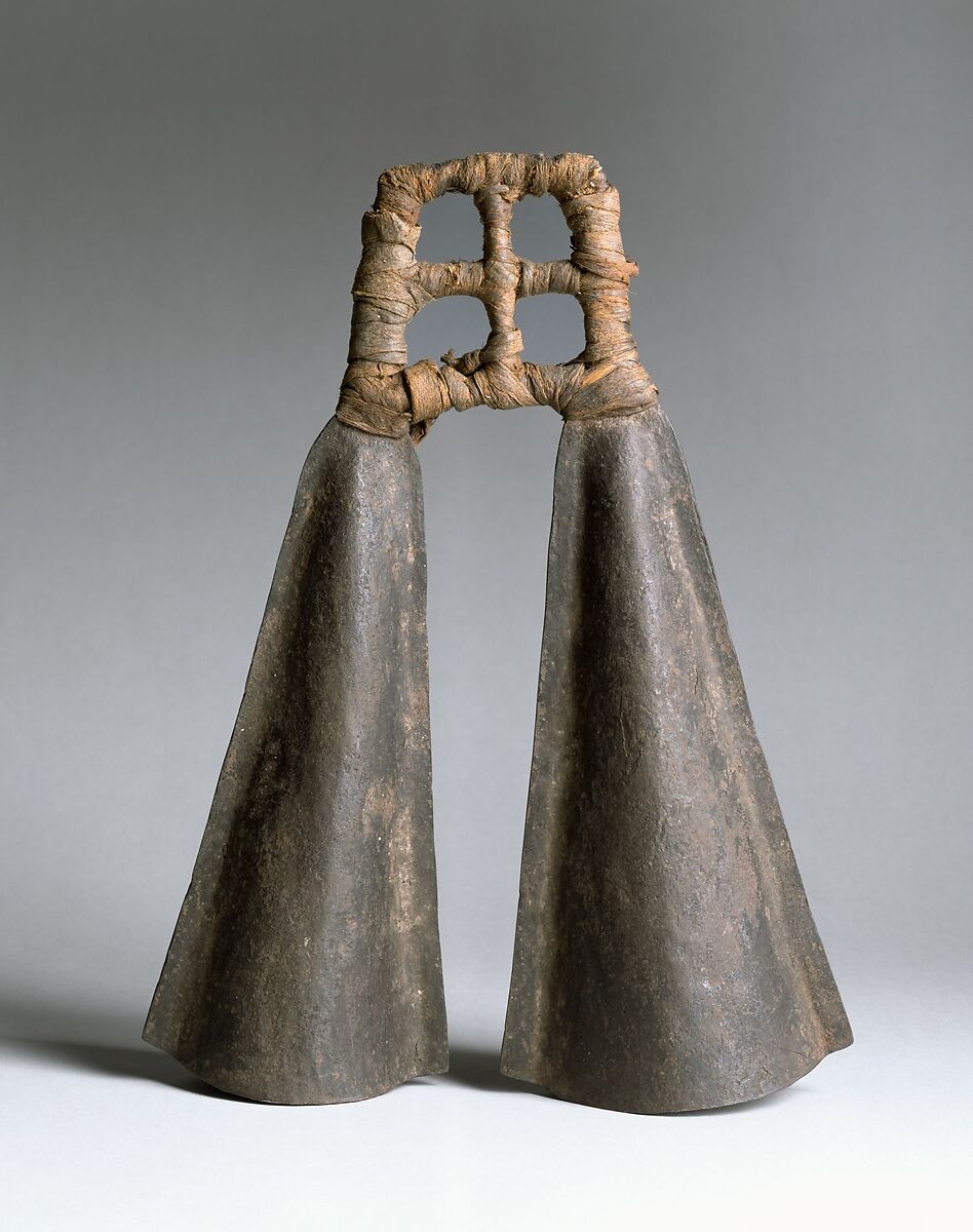 This double bell is played by striking it with a wood beater and produces two pitches a fourth apart. Single and double bells made from forged iron are widespread in West Africa and have many different names. Agogo, a term used by the Yoruba and other Nigerian peoples, is also found in Afro-Caribbean cultures. The bells are sounded to send messages, make announcements, and perform divination. The bell's timbre is varied by letting it ring freely or by damping it against the chest.