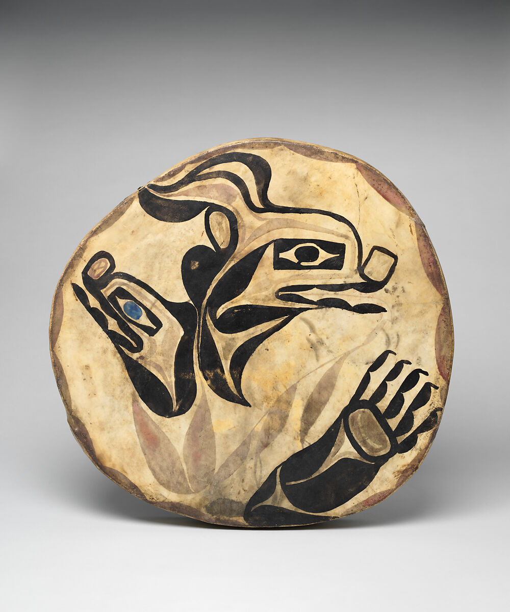 This drum is made of split red cedar that has been incised with crosshatching on the interior wall to relieve the surface tension inherent to the bending process. The painting on the drumhead illustrates two memorial, sometimes known as totemic, figures. Painted in a stylized manner that is not characteristic of Haida two-dimensional art, the figures most likely represent spirit guides, perhaps a wolf or bear, and an otter or salmon. Although now faded, the pigment used to create the painting is primarily red and black. The vibrant blue of the smaller figure's eye is evidence of synthetic pigments that were introduced into the area.