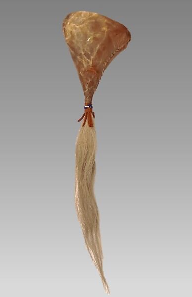- Medium: animal bladder, buckskin, beads, horsehair, sinew, pebbles, red stain