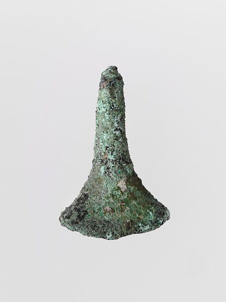 This cone-shaped bell with wide flaring opening is missing its clapper. It may have been worn as a neck ornament.