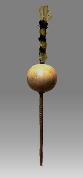 This gourd rattle decorated with yellow and black features was used to accompany dance among the Atoradis people of the Ataro Valley.