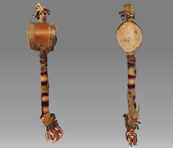 - Medium: wood, metal, rawhide, glass beads, cloth, varnished paper?