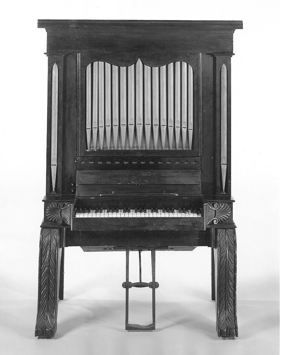 Technical description: One 53-note manual F-a3 with ivory naturals, ebony sharps; disposition from rear of chest, with basses arranged at sides: 8' Stopped Bass F-c, 8' Stopped Flute from c# (open from a#2), 4' open Principal (four bass pipes on each side), 8' Flute stopped f-cl, open from c#1 (probably common 8' stopped bass F-f); two wood knobs with ivory center dot apparently control two front registers; no slide for back register; all pipes of conifer (possibly spruce) with hardwood caps; stoppers tapered except for bass stoppers which are untapered; no nicking, open feet, open pipes tuned with soft metal blades at top; single-fold feeder under chest operated by single pedal at front; single-fold reservoir on top of case, connected by wood ducts to feeder; from c#, trackers fan out to pallet box at back of chest; bass (F-c) has eight rollers and must always be on since pallet box has only 45 notes; stop action for two front registers uses two heavy wood connections apparently milled from single piece which also forms shank and knob; four miscellaneous springs below bass end of chest perhaps meant to lighten action on stiff notes; case possibly mahogany, heavily varnished, center front of half-round, gold-painted dummy pipes with fabric (possibly silk)behind, also the same fabric in side panels; supported by heavy curved legs, front two having carved leaf motif on front; machine-carved scallop motifs flank keyboard. (Laurence Libin 1997)