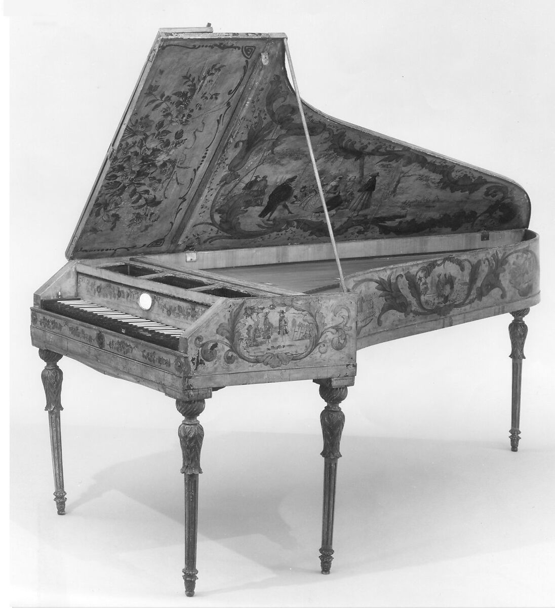 Technical description: Wing-shaped case on 4 detachable carved legs, wood; compass, 5 octaves, 2 semitones, with black naturals, white sharps; hammers divided at b-c1 by wood gap spacer over which runs a pair of unstruck strings that have their own damper; ebony natural heads have double score lines, tails are ebony or stained pear, accidentals of stained pear with bone tops; hammer shanks and escapement levers almost identical with those of Stein piano at Toledo Art Museum; keyboard of quarter-sawn spruce, having no buttons at balance point, but the keys are mortised for the pins; kapsels, shanks, escapement levers, damper jacks and blocks of pear; hammers of beech covered with 1 layer of leather (thick in bass, thin in treble); typical Stein box guide at rear of keys; soundboard of quarter-sawn spruce with bridge and nut of maple or beech painted black; top of pinblock veneered to match soundboard, but with grain running from bass to treble.