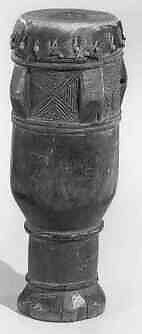 Drum with buttoned head attachment. Sub-Saharan drums feature numerous body shapes and ingenious ways of attaching the skin heads. Drums often incorporate tone modifiers, including metal plates with rattling rings, small bells, mirlitons (buzzing membranes), or rolling balls inside the body. In some areas, drums embody the kinship system and are grouped in families with the "mother" drum playing the central role. Drums may be incised with patterns related to fabric designs or sculpted with symbolic motifs that reinforce social identity.