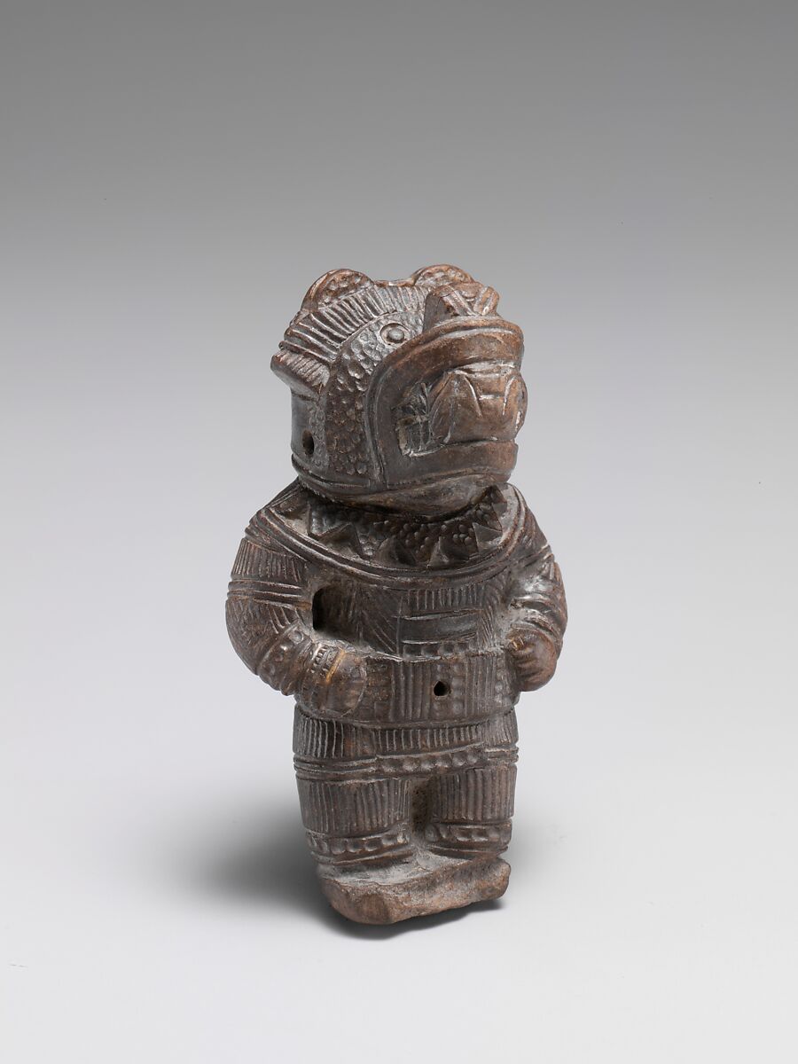 Flutes and bells are all that remain of many musical traditions of the Tairona people of the Sierra Nevada de Santa Marta region, Colombia. The importance of these metal, terracotta, and blackware instruments is evident in their carefully detailed incising and punctuation. The symbolic meanings of the effigies are obscure, and the relationship between the forms and their musical functions is unclear. It is believed that musical effigies served as talismans and were played to link the mortal and immortal realms.