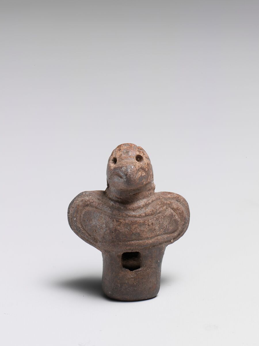 Flutes and bells are all that remain of many musical traditions of the Tairona people of the Sierra Nevada de Santa Marta region, Colombia. The importance of these metal, terracotta, and blackware instruments is evident in their carefully detailed incising and punctuation. The symbolic meanings of the effigies are obscure, and the relationship between the forms and their musical functions is unclear. It is believed that musical effigies served as talismans and were played to link the mortal and immortal realms.