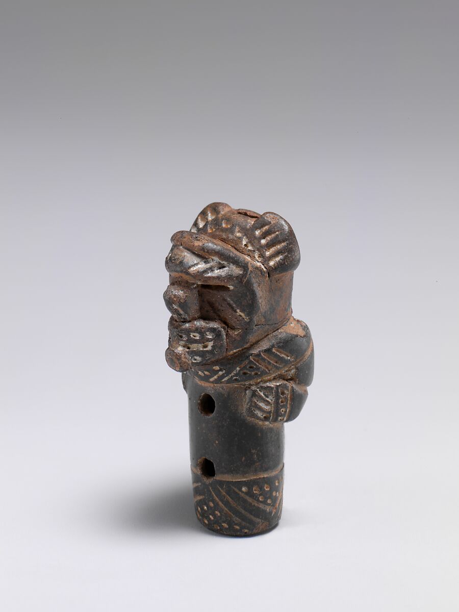 Flutes and bells are all that remain of many musical traditions of the Tairona people of the Sierra Nevada de Santa Marta region, Colombia. The importance of these metal, terracotta, and blackware instruments is evident in their carefully detailed incising and punctuation. The symbolic meanings of the effigies are obscure, and the relationship between the forms and their musical functions is unclear. It is believed that musical effigies served as talismans and were played to link the mortal and immortal realms.