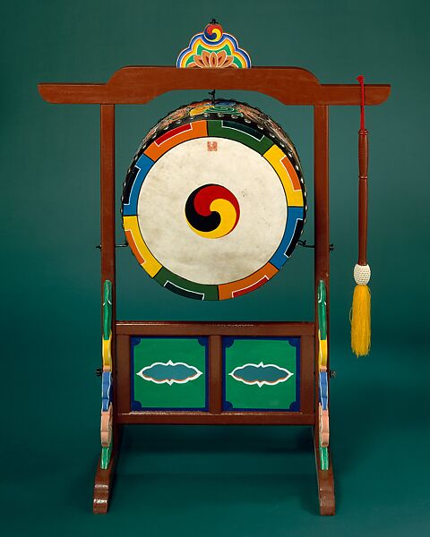 Description: Cylindrical drum attached vertically by three hooks to a two-armed frame which is painted red and decorated with painted flower motifs; two skin heads attached to drum by concealed nails and large decorative metal tacks spaced evenly around circumference; red, yellow, and black painted triple helix in center and decorative border around perimeter of each head; body covered with canvas with two yellow and blue painted dragons, each chasing a jewel; rattle inside drum; one red-painted wood stick with bulbous tip covered with crocheted string and tassel. (J. Kenneth Moore, 1982)