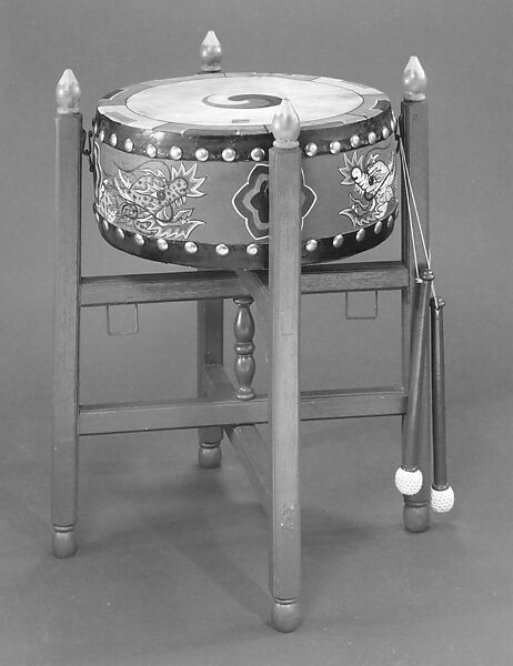 Description: Cylindrical drum suspended horizontally by four hooks within a square wood stand formed by four vertical arms with lotus finials and two horizontal arms; two skin heads attached to drum body by concealed nails and large decorative metal tacks spaced evenly around circumference; red, yellow, and blue painted triple helix and decorative borders on each head; canvas covered body with two yellow and blue painted dragons; two wood sticks, each with red handle and bulbous tip with crocheted string cover. (J. Kenneth Moore, 1982)