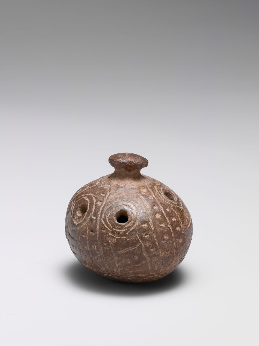 Flutes and bells are all that remain of many musical traditions of the Tairona people of the Sierra Nevada de Santa Marta region, Colombia. The importance of these metal, terracotta, and blackware instruments is evident in their carefully detailed incising and punctuation. The symbolic meanings of the effigies are obscure, and the relationship between the forms and their musical functions is unclear. It is believed that musical effigies served as talismans and were played to link the mortal and immortal realms.