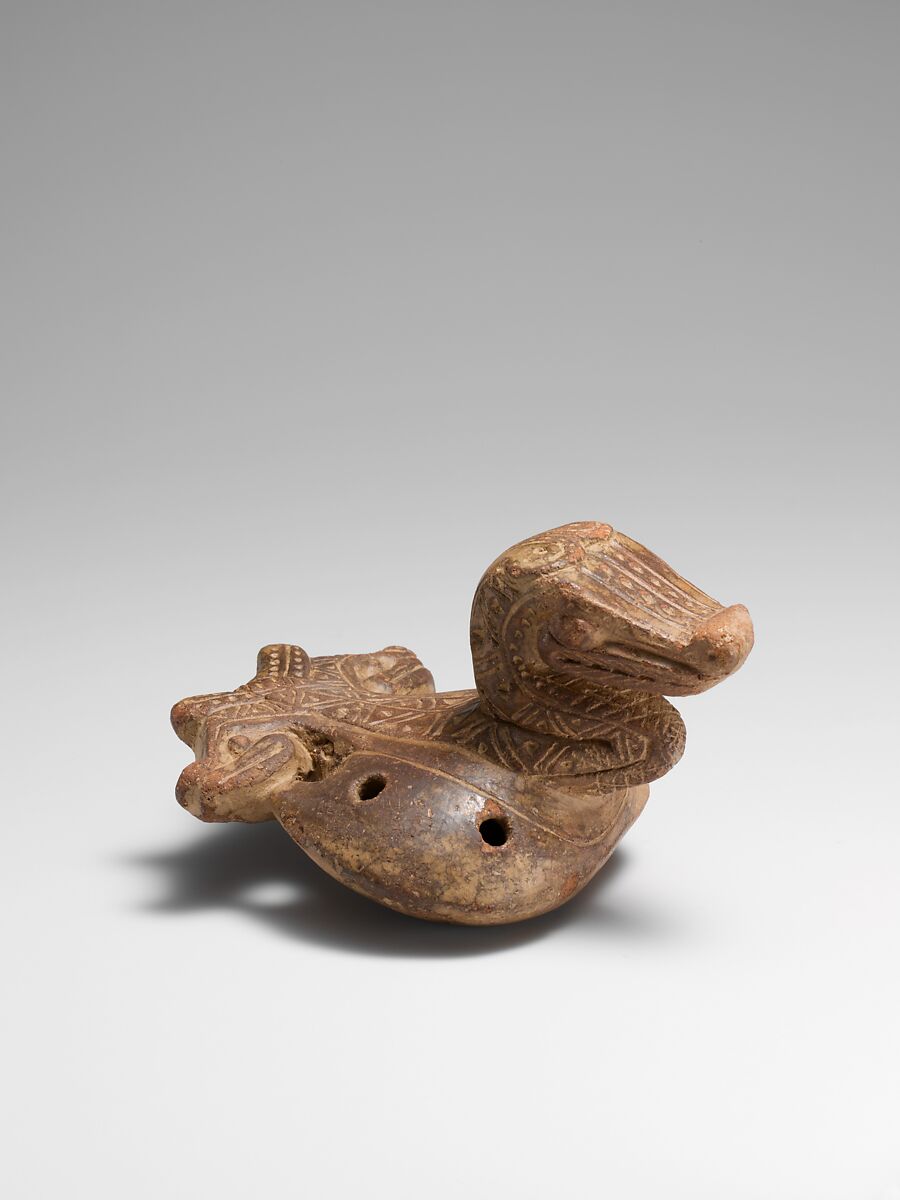 Flutes and bells are all that remain of many musical traditions of the Tairona people of the Sierra Nevada de Santa Marta region, Colombia. The importance of these metal, terracotta, and blackware instruments is evident in their carefully detailed incising and punctuation. The symbolic meanings of the effigies are obscure, and the relationship between the forms and their musical functions is unclear.