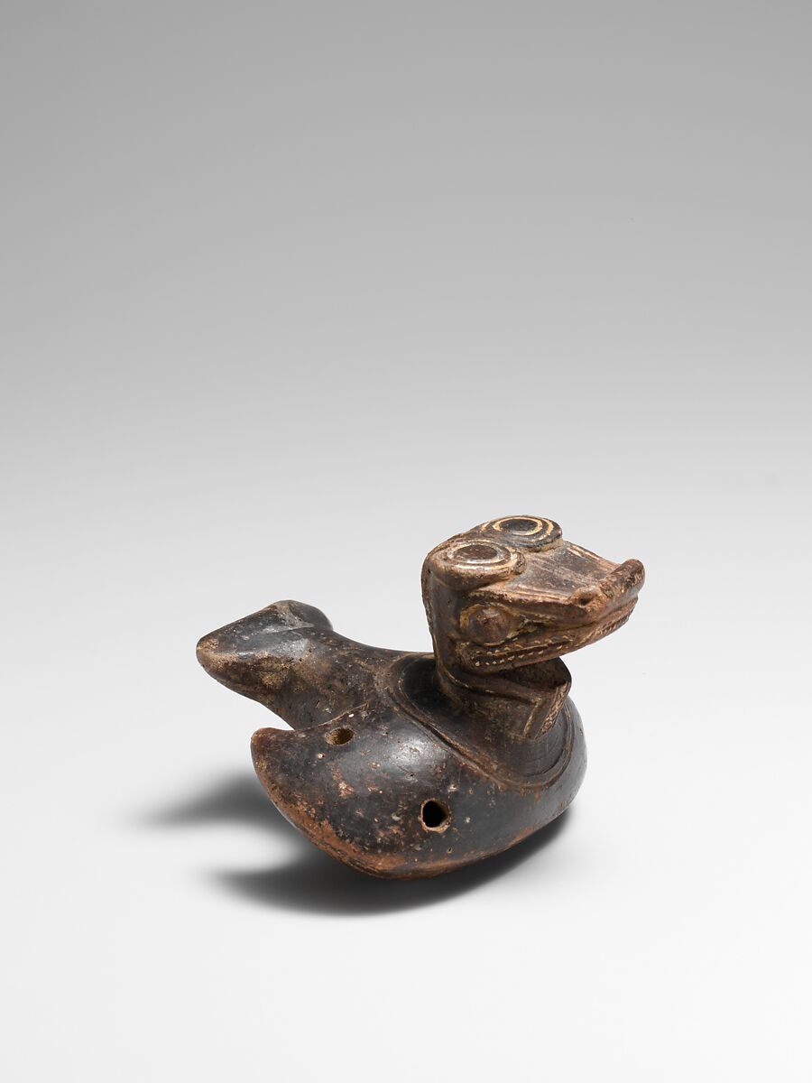 Flutes and bells are all that remain of many musical traditions of the Tairona people of the Sierra Nevada de Santa Marta region, Colombia. The importance of these metal, terracotta, and blackware instruments is evident in their carefully detailed incising and punctuation. The symbolic meanings of the effigies are obscure, and the relationship between the forms and their musical functions is unclear. It is believed that musical effigies served as talismans and were played to link the mortal and immortal realms.