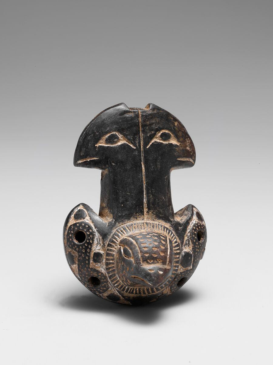 Flutes and bells are all that remain of many musical traditions of the Tairona people of the Sierra Nevada de Santa Marta region, Colombia. The importance of these metal, terracotta, and blackware instruments is evident in their carefully detailed incising and punctuation. The symbolic meanings of the effigies are obscure, and the relationship between the forms and their musical functions is unclear. It is believed that musical effigies served as talismans and were played to link the mortal and immortal realms.