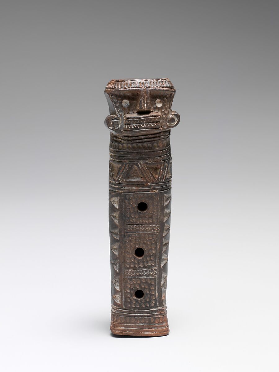 Flutes and bells are all that remain of many musical traditions of the Tairona people of the Sierra Nevada de Santa Marta region, Colombia. The importance of these metal, terracotta, and blackware instruments is evident in their carefully detailed incising and punctuation. The symbolic meanings of the effigies are obscure, and the relationship between the forms and their musical functions is unclear. It is believed that musical effigies served as talismans and were played to link the mortal and immortal realms.