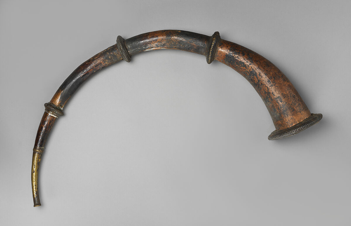 A shallow bowl-shaped mouthpiece is consistent among the conical natural trumpets called narsĩngā in Nepal. However, the degree of curvature and length changes from region to region. In West Nepal, they are shorter and have less of a curve, are used with the karnāl, and occasionally with massed damāhā. In eastern Nepal, the Gorkha musicans have a very sophisticated playing technique that employs circular breathing and a type of flutter tonguing. Collected in Kalikot, Karnāl District, Nepal.