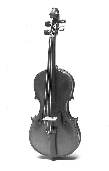 Description: 1/64 size; one-piece maple back with faint horizontal figure; similar ribs; unfigured neck and scroll; spruce (?) top of even medium grain; ebony pegs, nut, tailpiece, saddle and tail pin; ebonized fingerboard; single purfling; brown and orange varnish.