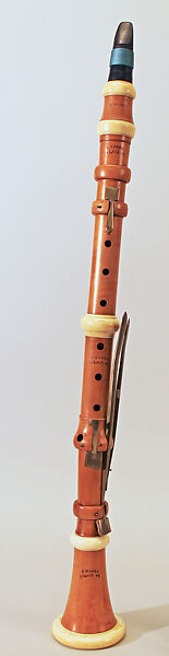 Technical description: Boxwood with ivory ferrules and brass keywork. Five pieces: mouthpiece, barrel, upper section, lower section, bell. Long tenon ebony mouthpiece grooved for cord. English-style flask shaped barrel. Square wooden rings. Speaker liner projects almost to the centre of the bore. Speaker key guided with a pin. Very unusual arrangement. Levers for L4, tone-hole and key for R4 mounted in a bell-shaped swelling. Zig-zag F♯3/C♯5 lever guided with a pin, which is an elegant solution. The usage of guidance pins for two of the keys and the robust appearance of the instrument leads to the assumption that this instrument was intended to be used by beginners. Bevelled G♯3/E♭5.