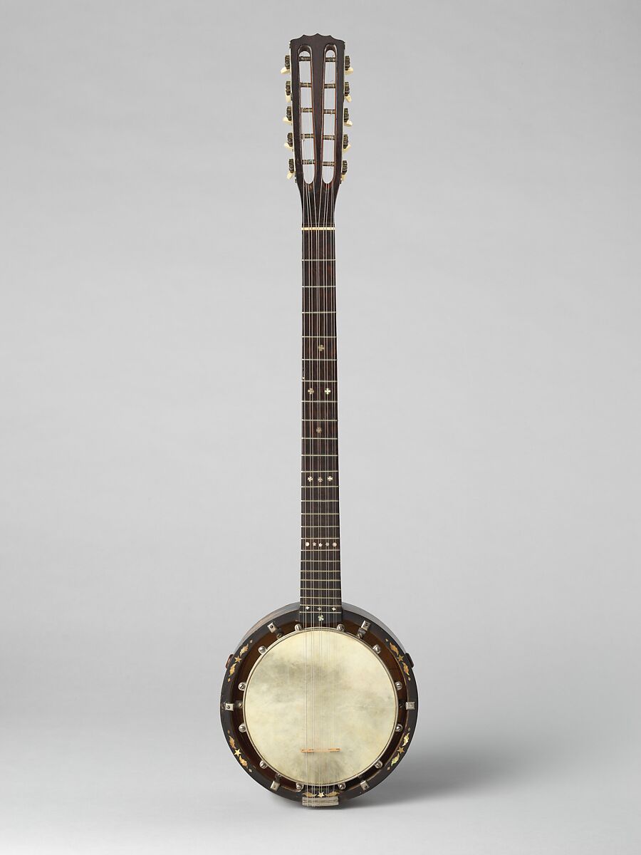 The banjo has several uncharacteristic features for the period. The metal rim, over which the skin head is stretched, is of unusually small diameter and is mounted within a wood resonator with a marquetry-decorated outer rim and curved back. The slotted peghead, with geared machine tuners on either side, is more commonly found on guitars than banjos. The ten strings are organized in five courses of two strings each. The most unusual feature is that one of the pair of fifth drone or thumb strings enters a "tunnel" under the fingerboard at the fifth fret position. The string emerges at on the peghead side of the nut at the end of the fingerboard where it can be adjusted by a machine tuner, thereby eliminating the need for a tuning peg positioned at the fifth fret for tightening a short drone string.
