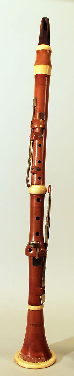Technical description: Boxwood with ivory ferrules and brass keywork. Five pieces: mouthpiece, barrel, upper section, middle joint for the fingers of the right hand and lower joint with keys in one section, bell. Rosewood mouthpiece with a long tenon to fit the English-style flask shaped barrel, grooved for cord, and probably not original. Barrel unstamped and possibly not belonging to the instrument. Rudiments of square wooden rings like on other Goulding clarinets. Speaker liner projects almost to the centre of the bore. Levers for L4, tone-hole and key for R4 mounted in a bell-shaped swelling. Zig-zag F♯3/C♯5 lever guided in rudiment of a square wooden ring. Bevelled G♯3/E♭5.
