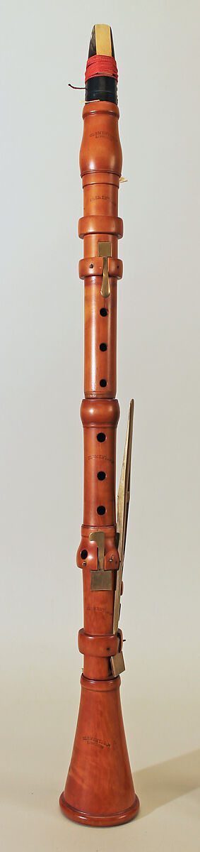 Technical description: Boxwood with integral wooden ferrules and brass keywork. Six pieces: mouthpiece, barrel, upper section, middle section for the fingers of the right hand, lower section with keys, bell. Long tenon ebony mouthpiece stamped "I. WOOD FECIT" presumably original to the instrument. The stamp is on the reed side of the mouthpiece indicating that it is played with the reed to the upper lip. English-style flask shaped barrel. Speaker, throat A and bascule key mounted in square turned wooden rings. Speaker liner projects almost to the centre of the bore. Levers for L4, tone-hole and key for R4 mounted in a bell-shaped swelling. Zig-zag F♯3/C♯5 lever guided in a rudiment of a turned wooden ring. Bevelled G♯3/E♭5 touchpiece. Bell continous.