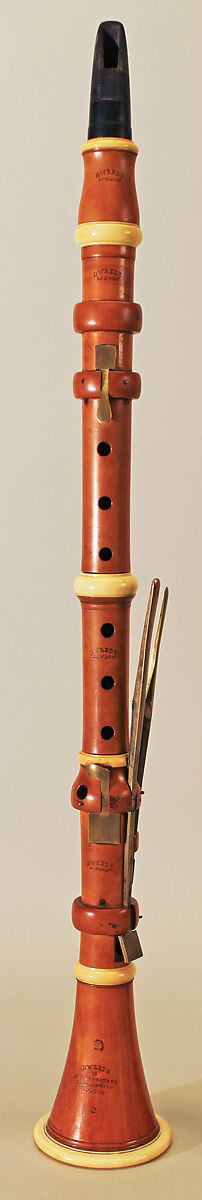 Technical description: Boxwood with ivory ferrules and brass keywork. Six pieces: mouthpiece, barrel, upper section, middle section for the fingers of the right hand, lower section with keys, bell. Long tenon ebony mouthpiece grooved for cord. English-style flask shaped barrel. Square wooden rings strengthened with pins. Speaker liner projects almost to the centre of the bore. Levers for L4, tone-hole and key for R4 mounted in a bell-shaped swelling. Zig-zag F♯3/C♯5 lever guided in a rudiment of a square wooden ring. Bevelled G♯3/E♭5 touchpiece.