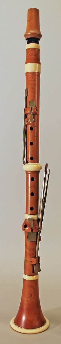 Technical description: Boxwood with ivory ferrules and brass keywork. Six pieces: mouthpiece, barrel, upper section, middle section for the fingers of the right hand, lower section with keys, bell. Long tenon ebony mouthpiece grooved for cord. English-style flask shaped barrel. Speaker liner projects almost to the centre of the bore. Pins at the blocks in order to avoid cracking. Levers for L4, tone-hole and key for R4 mounted in a bell-shaped swelling. Zig-zag F♯3/C♯5 lever guided in a rudiment of a round ring.