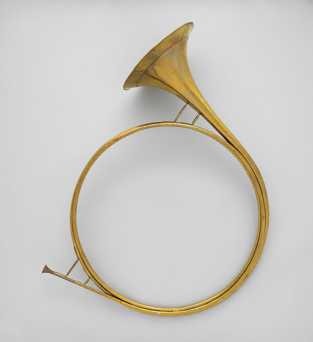 Hunting horns are natural brass instruments (that is, without valves) and like bugles, sound only the limited sequence of notes in the harmonic series. This hunting horn is of the type called a trompe dauphine, which became the official hunting horn of the French court in 1729. As such, it was used until the French Revolution. Later, slightly smaller versions came into use.