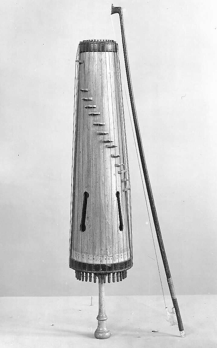 Technical description: Bowed zither with sixteen wire strings passing over individual moveable wood bridges arranged on a diagonal line over the curved belly; the body trapezoidal in outline and half-circular in cross-section, being a longitudinal half section of a tapering hollow cylinder of pine; the strings pass over wire nuts atop raised wood bands at each end, and hitch to nails on the smaller end and to small pierced iron tuning pins on the larger end; also on the larger end, a tuned hickory handle, and a smaller handle protruding from the back; two soundholes (straight slots terminating in round holes) on the belly; beneath the strings at the larger end, a strip of paper numbering and naming each string diatonically C to D of the second octave above (bass string is C number 1, highest string is D number 16). Played with a common painted violin bow.