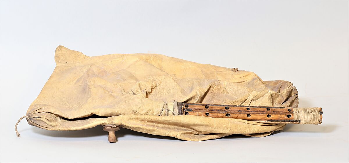 Goat or kidskin bag, with blowpipe tied directly into hole in bag and chanter sleeve serving as stock in one foreleg.