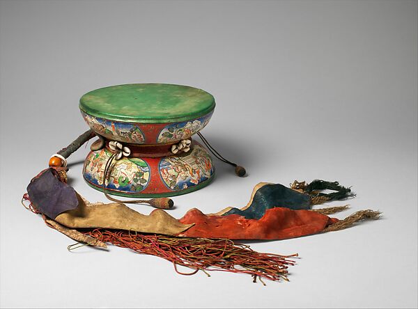 Tibetan Budhist monks and shamans use this type of drum to interrupt phrases of recitation when it is necessary to summon certain deities. A pelting sound is produced when the drum is rotated back and forth in the right hand as the attached cloth beads strike the drum. Scenes from the life of Milarepa (1052-1135), Tibet's greatest poet, yogi, and saint, decorate the sides of the drum.