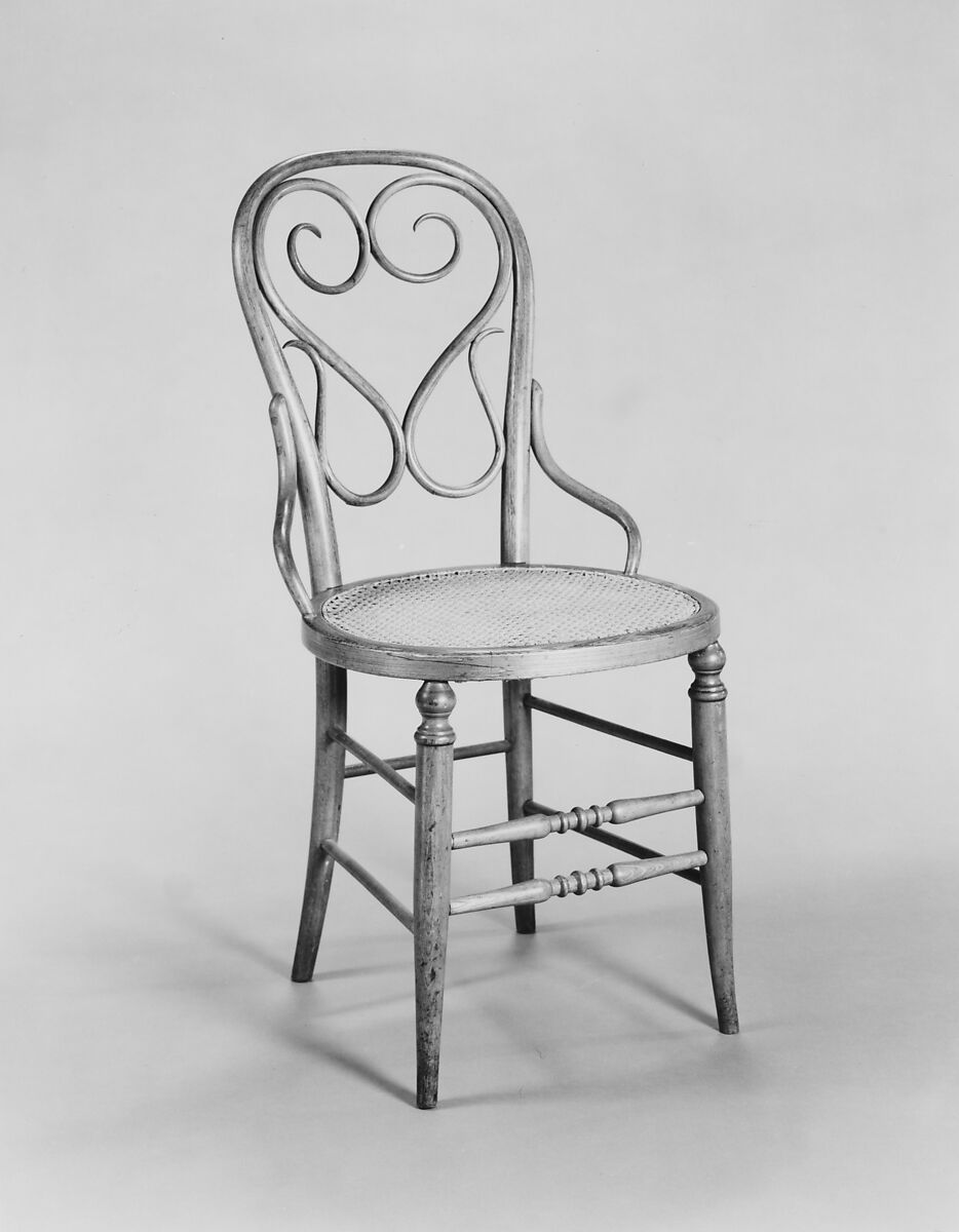 This chair, patented by Henry I. Seymour on May 31, 1870, was modeled closely after a well-known chair designed around 1850 by the German-born designer Michael Thonet (model number 4) which is pictured on a Thonet advertising broadside dated 1866. Seymour added braces for greater stability and used straight turned, rather than bent and curved stretchers. Thonet's patent on the bentwood technique expired on December 10, 1869, prompting manufacturers on both sides of the Atlantic to adopt and adapt his designs in order to capture a percentage of the lucrative market for bentwood furniture. Seymour seems to have been the first American manufacturer to do so. Documented pieces of American bentwood furniture, such as this chair, are rare. A nearly identical chair is in the collection of the New York State Museum in Albany, New York.