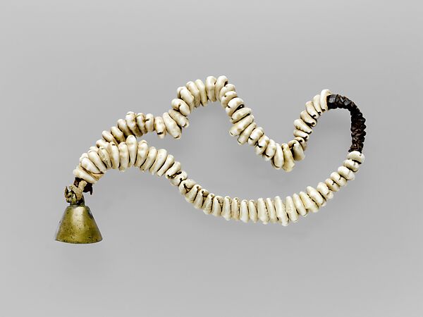 Small bronze clapper bell secured to a braided leather rope decorated with pierced cowry shells.